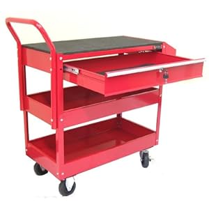 Steel tool cart with one drawer, rubber work surface, two trays, side handle, powder coat paint finish and 4 x 1 inch casters