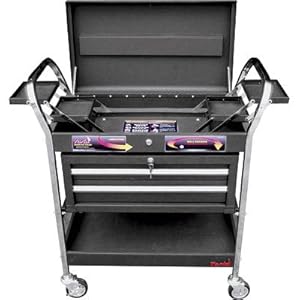 The convenient handles make it easy to move the cart wherever you need to get the job done. Ships in two boxes. Lock Included: Yes, Material Type: Steel, Adjustable: No, Shelves (qty.): 1, Doors (qty.): 1, Drawers (qty.): 2, Wheel Type: Caster, Finish Type: Powder coat, Color: Black, Foldable: No, Includes: Deep locking tool box on top